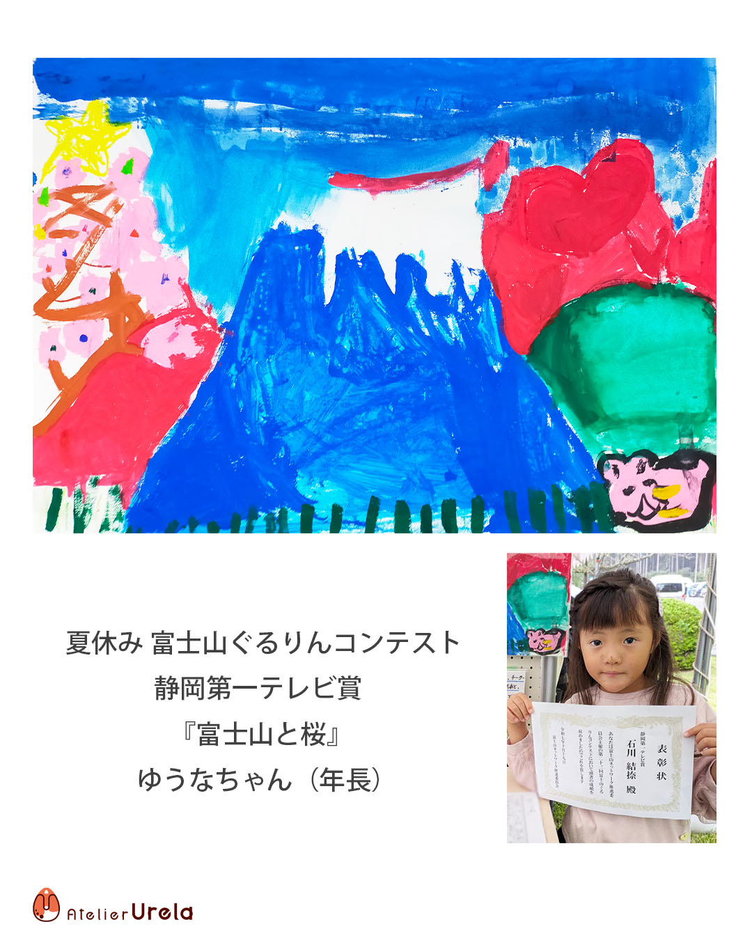 OCT 27 2025 生徒さん作品 【夏休み 富士山ぐるりんコンテスト入賞】 生徒さんから、コンテスト入賞の嬉しい知らせが届きましたのでご報告です! キッズクラスで制作した ゆうなさんの作品が、『夏休み富士山ぐるりんコンテスト 静岡第一テレビ賞』に輝きました! 元気いっぱいの色使いと、ゆうなさんの可愛らしい表現が目を引く素晴らしい作品になりました☆ 入賞、本当におめでとうございます! Post Share Hatena Pocket RSS feedly Pin it 投稿者: アトリエユレーラ生徒さん作品キッズクラス, コンテスト入賞, 作品, 幼児, 生徒さん作品コメント: 0 【明るい選挙啓発ポスターコンクール... 【富士山への手紙・絵コンクール入賞...